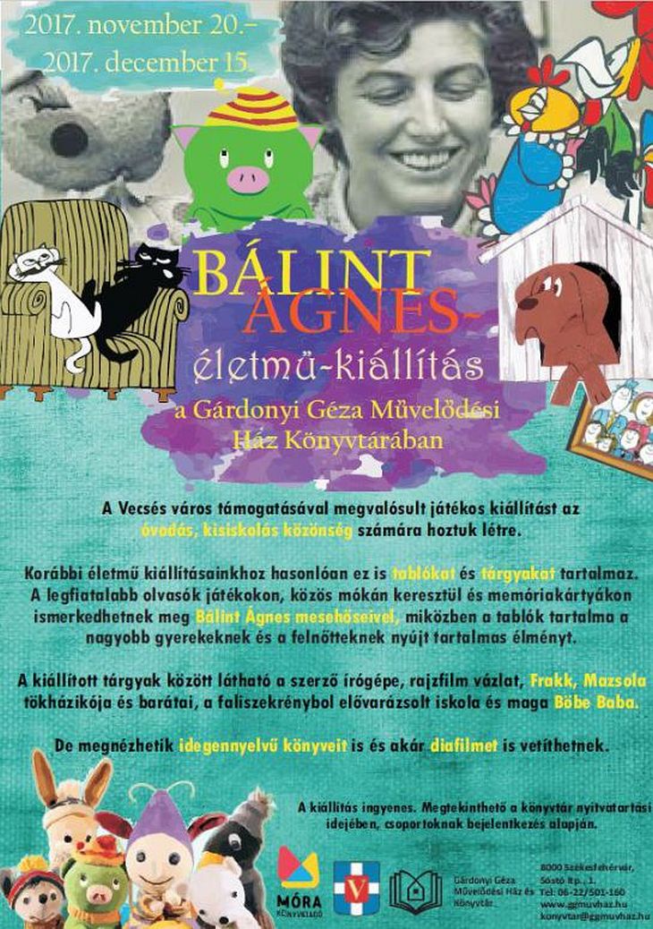 Hétfőtől december közepéig lehet megnézni a Gárdonyi Géza Művelődési Ház és Könyvtárban a Bálint Ágnes életművét bemutató kiállítást: tablókkal, játékokkal, diafilmekkel, Böbe Babával és Mazsola tökházikójával várják az óvodásokat, a kisiskolásokat és minden érdeklődőt. A tárlat a könyvtár nyitvatartási idejében látogatható.
