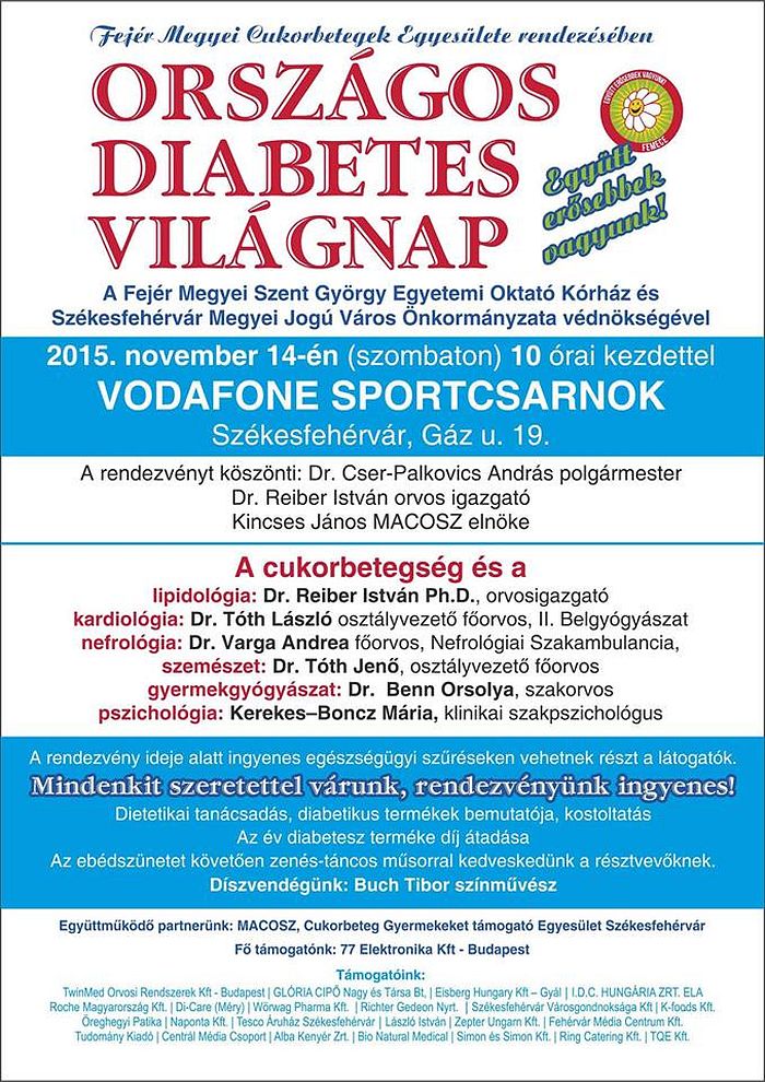 Magyarországon jelenleg több, mint félmillió diagnosztizált cukorbeteg él, és további 250 ezer azoknak a száma, akik már cukorbetegek, de még nem tudnak róla. A kilátások még riasztóbbak, hiszen 10 év múlva a 20-70 év közötti korosztályban már minden tizedik ember cukorbeteg lesz hazánkban! Az Országos Diabétesz Világnapot november 14-én Székesfehérváron rendezik meg.
