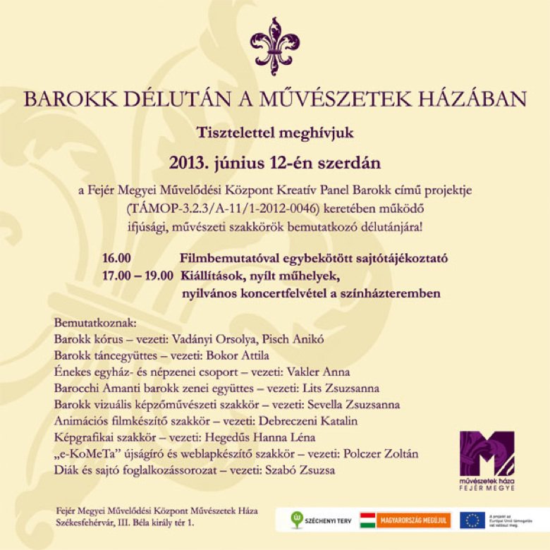Kiállításokkal, filmbemutatókkal, nyilvános koncertfelvételekkel mutatkoznak be a Megyei Művelődési Központ Kreatív Panel Barokk projektjének ifjúsági, művészeti szakkörei június 12-én, szerdán 17 órától a Művészetek Házában. A TÁMOP-3.2.3/A-11/1-2012-0046 pályázat keretében működő projekt tavaly ősszel indult, és az azóta eltelt hónapokban látványos eredmények születtek, amelyekből most a nagyközönség is ízelítőt kaphat zene, tánc és képzőművészeti bemutatók formájában. A rendezvényre a belépés ingyenes.