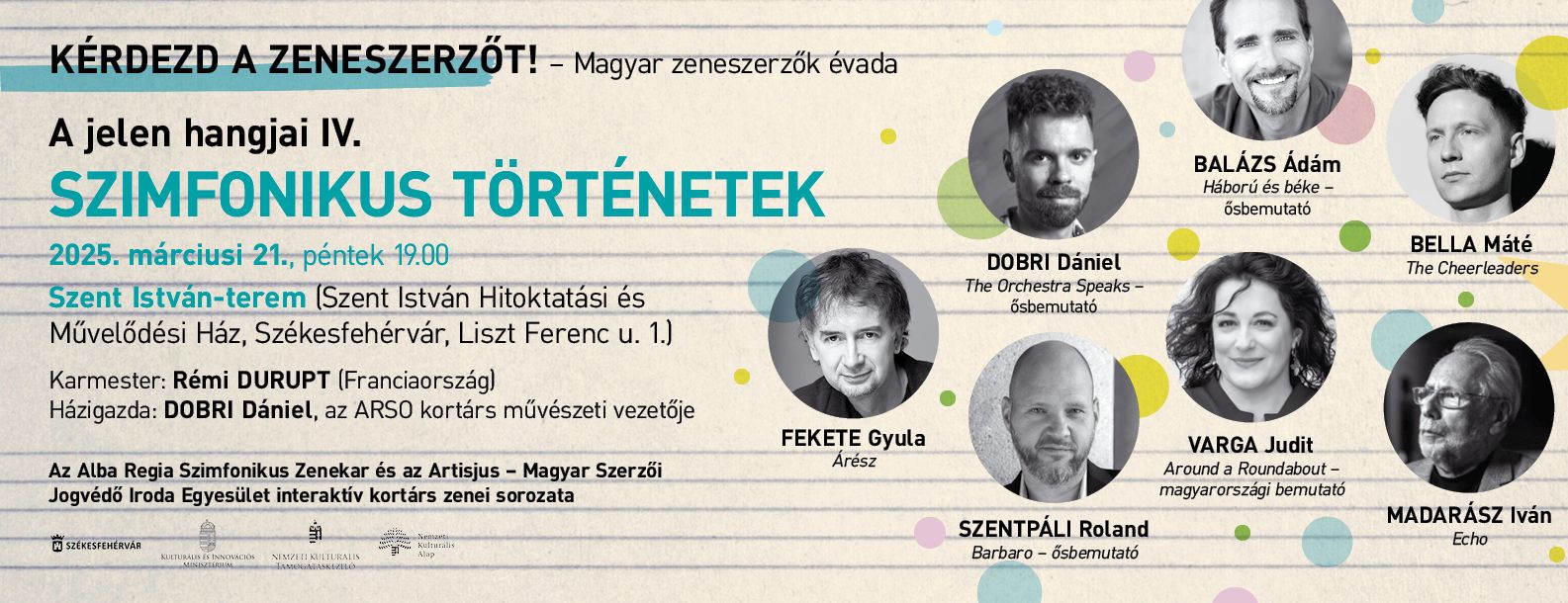 A „Kérdezd a Zeneszerzőt!” kortárs koncertsorozat keretében, annak évadzáró eipzódjaként szervezi meg az Alba Regia Szimfonikus Zenekar a „Szimfonikus történetek” című interaktív estet március 21-én, pénteken este 19 órai kezdettel a Szent István Hitoktatási és Művelődési Ház Szent István termében.