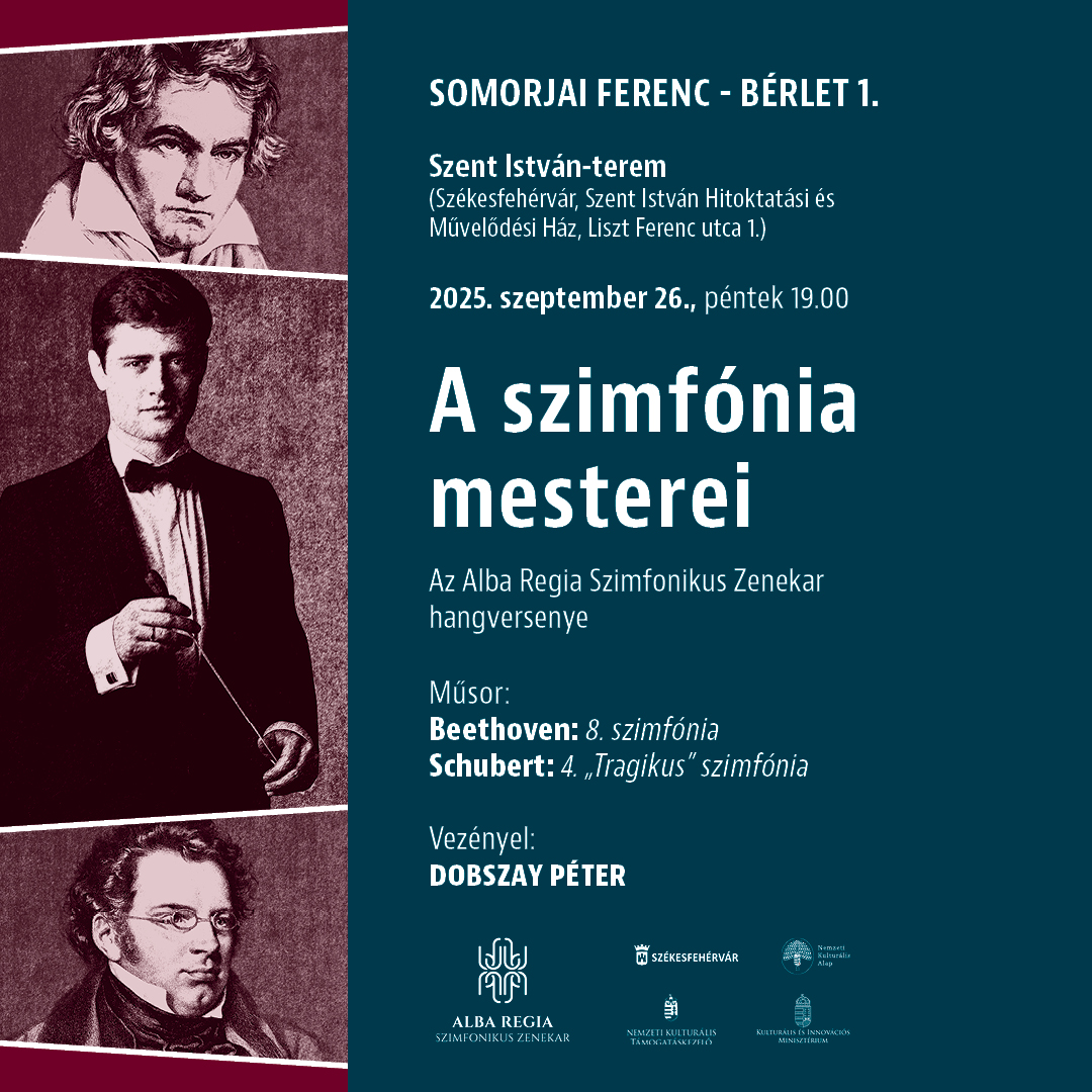 A szimfónia mesterei és az Alba Regia Szimfonikus Zenekar szeptember 26-án, pénteken este 7-kor nyitja meg a szimfonikus szezont a Szent István-teremben (Szent István Hitoktatási és Művelődési Ház, Székesfehérvár, Liszt Ferenc utca 1.) Jegyek még kaphatóak!