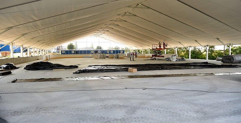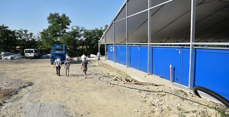 Haluza Valéria, a Haluza és Társa Kft. ügyvezetője elmondta, hogy a földmunkákkal kezdték az építkezést április végén. Azóta elkészült a „C” pálya épületének alapteste, megépült a tűzivíztároló, továbbá a hűtővezetékeket és a hűtőbetont is ráhelyezték a pályára. Jelenleg a sátorszerkezet, a palánkrendszer, a konténeres öltöző és vizesblokk rendszer, valamint a szükséges légtechnika végső szerelési fázisai zajlanak, amelyek a tervek szerint jövő héten, a pályázatokban vállalt határidőre befejeződnek.