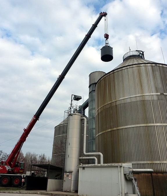 Utolsó látványos fejezetéhez érkezett a FEJÉRVÍZ ZRt. Székesfehérvári Szennyvíztisztító Telepén az egyik iszapfermentáló torony felújítása: a tűzoltóság darujával emelték 25 méter magasba a torony új 660 kg súlyú gázharangját.