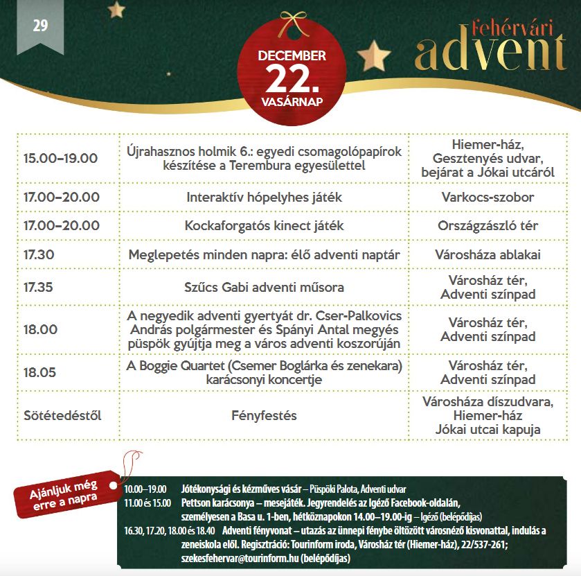 Advent negyedik hétvégéjén is sok program közül választhatnak a fehérváriak. Szombaton az adventi színpadon Bebe és a Boka Boogie Band is zenél. Vasárnap a Városház téren a negyedik adventi gyertyát Cser-Palkovics András polgármester és Spányi Antal megyés püspök gyújtja meg a város adventi koszorúján.