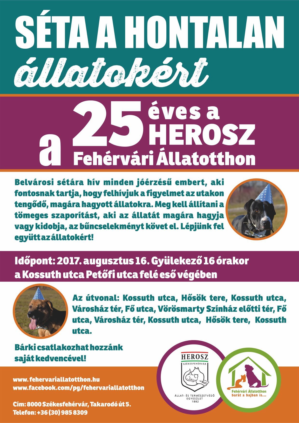 Egészen decemberig tartó programsorozattal ünnepli 25 éves fennállását a HEROSZ Fehérvári Állatotthona. A rendezvények keretében augusztus 16-án, szerdán belvárosi sétát szerveznek Székesfehérváron, hogy felhívják a figyelmet a kidobott, sorsukra hagyott állatok helyzetére, az örökbefogadás és a segítségnyújtás fontosságára, a tömeges szaporítás megállítására, illetve az állatvédő szervezetek és az önkéntesek áldozatos munkájára.