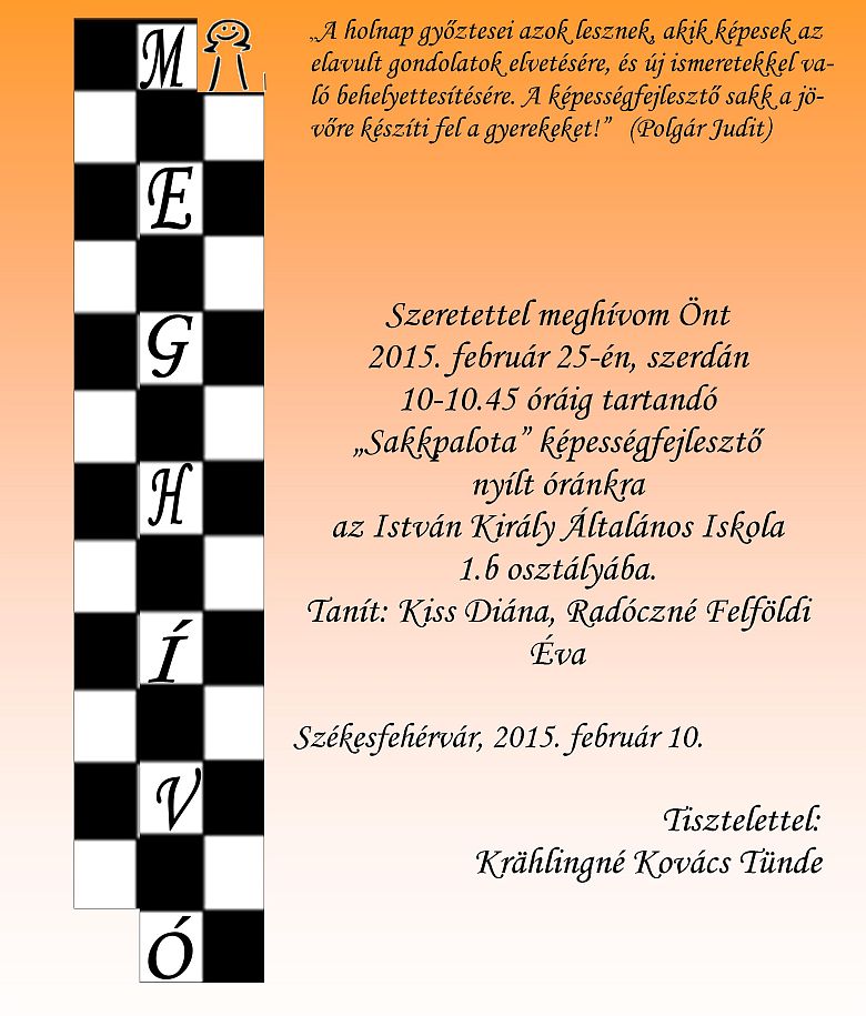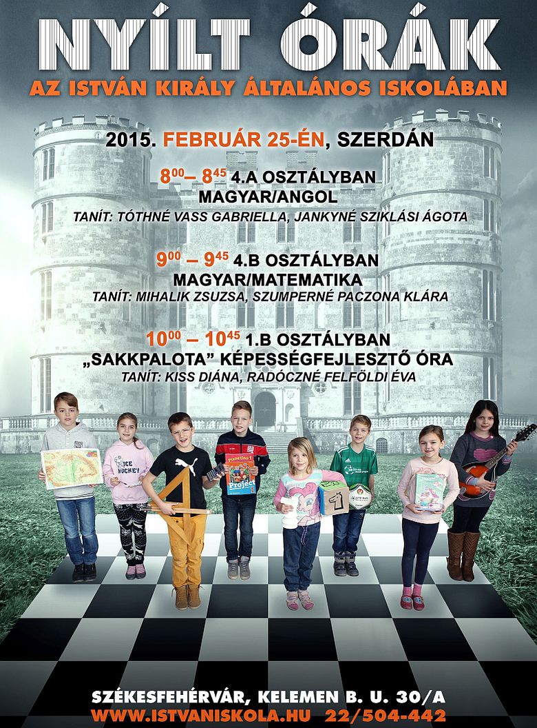 Nyílt tanítási órákat szerveznek február 25-én, szerdán délelőtt a Székes- fehérvári István Király Általános Iskolában. A harmadik órában a szülők megismerhetik a Sakkpalota képességfejlesztő foglalkozást, melyet a városban elsőként ebben az intézményben indítottak el. Ezen képességek megléte elengedhetetlen a sikeres tanítási-tanulási folyamatban.
