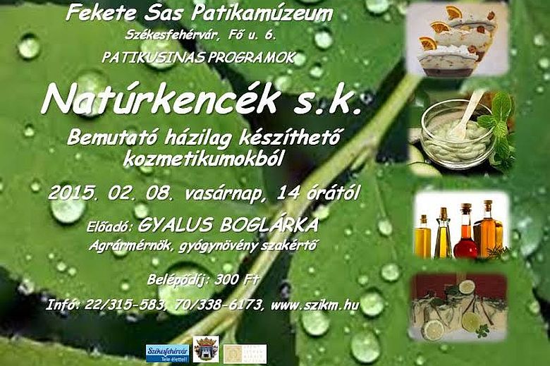2015. február 8-án, vasárnap kezdődik a Natúrkencék Saját Kezűleg című bemutató a Fekete Sas Patikamúzeumban. A program keretében Gyalus Boglárka agrármérnök gyógynövényszakértő tanítja meg a házilag készíthető, káros adalékanyagoktól mentes kozmetikumok és tisztítószerek gyártásának fortélyait. A délután 14 órakor kezdődő eseményen 300 Forintos belépő megvásárlásával lehet részt venni.