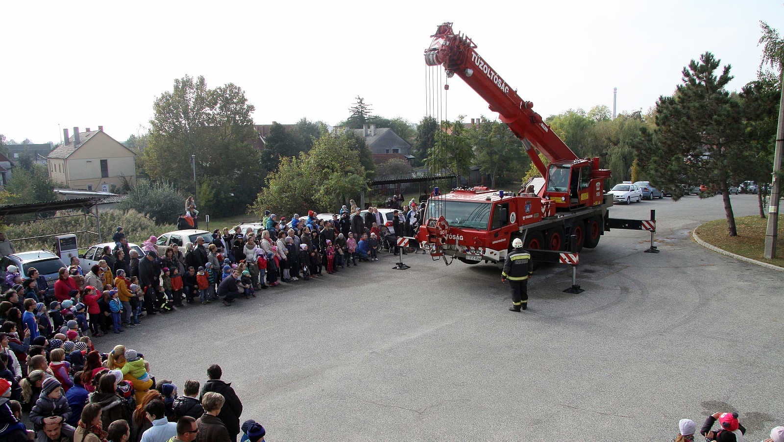 A több alkalommal megtartott próbariasztások, szerelési fogások ismertetése mellett természetesen az igazi „nagyágyúkat” az ötven tonna emelésére alkalmas tűzoltó autódarut és a negyvenkét méter magasból mentésre, tűzoltásra alkalmas létra szereket is bemutatták a kezelőik.