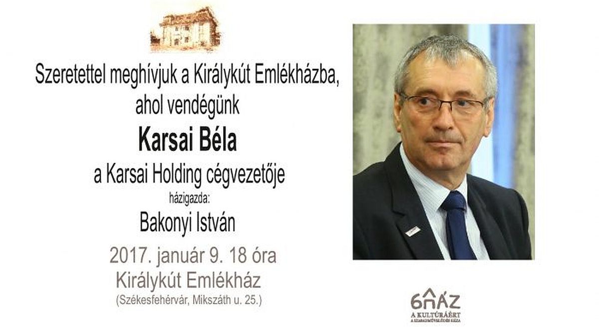 Hétfőn este újabb kulturális programra várják az érdeklődőket a Királykút Emlékházban. A 18.00 órakor kezdődő rendezvényen Karsai Béla, a Karsai Holding cégvezetője lesz a Királykút Emlékház vendége. A beszélgetést az est házigazdája, Bakonyi István József Attila-díjas irodalomtörténész vezeti, melyre várnak minden érdeklődőt.