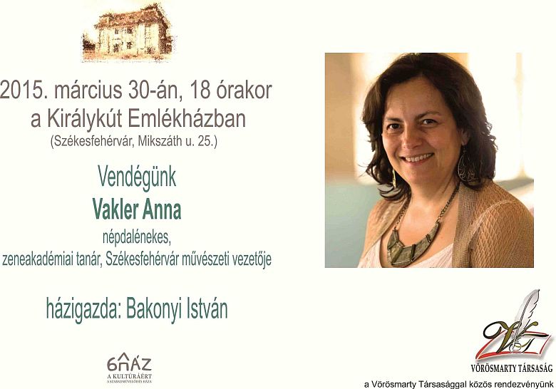 2015. március 30-án, hétfőn este újabb beszélgetős estét szerveznek a Királykút Emlékházban (Székes- fehérvár, Mikszáth utca 25.). Az eseményen az est házigazdájának, Bakonyi Istvánnak a vendége Vakler Anna népdalénekes, egyetemi tanársegéd, Székesfehérvár művészeti igazgatója lesz. A hétfőn este 18 órakor kezdődő programra sok szeretettel várnak minden érdeklődőt a szervezők.