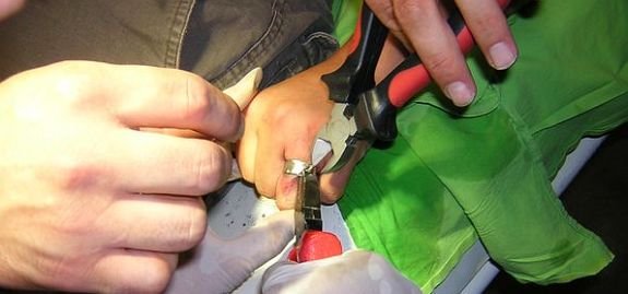Először óvatosan átfűrészelték - egy csavarhúzóval ügyelve arra, hogy ne sérüljön meg a fiú ujja -, majd fogókkal feszítették szét a karikát.