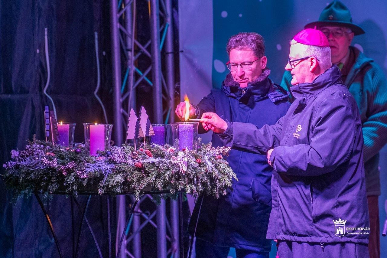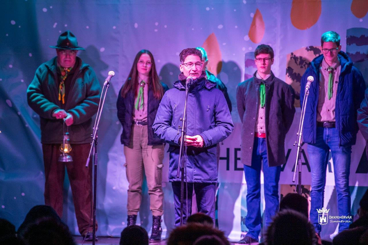 Dr. Cser-Palkovics András polgármester beszédében felidézte az első gyertyagyújtás örömét, amikor a mostani naphoz hasonlóan egy gyönyörű hangú kar, az ötszáz gyermek alkotta Kisangyalok Kara adta meg az ünnep szép, lelki hátterét. „Advent első gyertyájának lángra lobbantásakor azt kívántam és kértem mindenkitől, hogy ne átrohanjunk az adventen, hanem tudjunk megállni, tudjunk lelkiekben és szívben is felkészülni, elérni azt, hogy ez a sok-sok gyönyörű fény ne csak itt a környezetünkben, hanem a szívünkben is felgyulladjon.” – idézte fel a város polgármestere, aki örömét fejezte ki, hogy az ünnepvárás idején mindig nagyon sokan voltak a belvárosban. Sétálni, beszélgetni, lélekben töltekezni. „Bízom benne, hogy mindenkinek így teltek ezek a hetek, és így készülünk arra, hogy két nap múlva érkezzen az egyik legszentebb és legszebb ünnep, a karácsony. Azt kívánom, hogy békésen, szeretetben tudjuk megünnepelni, szeretteink társaságában. Kívánok önöknek áldott és békés karácsonyi ünnepeket, sok-sok szeretetet, mosolyt és azt, hogy lélekben is átéljük Szent Karácsony ünnepét!” – zárta gondolatatait Fehérvár polgármestere.