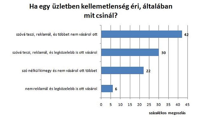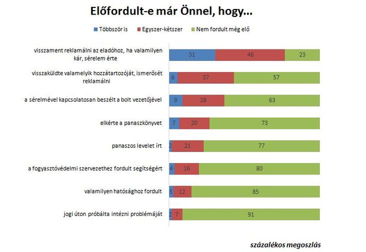 A kutatás során megkérdezték a válaszadókat, hogy bizonyos vásárlás során felmerülő problémák előfordultak-e már velük, és ha igen, akkor egy-kettő vagy esetleg több alkalommal. Reklamálni inkább visszamennek a vásárlók, de csak személyesen, és csak az eladóhoz, a nála magasabb beosztású személyhez, mint például boltvezető, már kevésbé, csak a megkérdezettek 9 százaléka mondta, hogy többször is előfordult, hogy reklamált volna nála, 28 százalékuk pedig, hogy egyszer- kétszer. Hatósághoz, fogyasztóvédelmi szervezethez szintén kevésbé fordulnak az emberek, és jogi útra sem jellemző, hogy terelnék az ügyet, 91 százalékuk állította, hogy még nem fordult elő, hogy így próbálta volna meg intézni a problémáját.