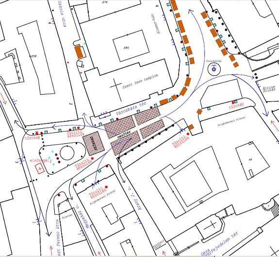 - A déli irányba az Arany János utcai kordont meg kell nyitni, de ekkor zárni kell a Városház tér 2. előtti épület előtti áthaladást az Arany J. utca vonalában. A színpadi szereplők, és a technikai személyzet a Városház tér 2. épületbe menekíthető azonnal, akadály nélkül.