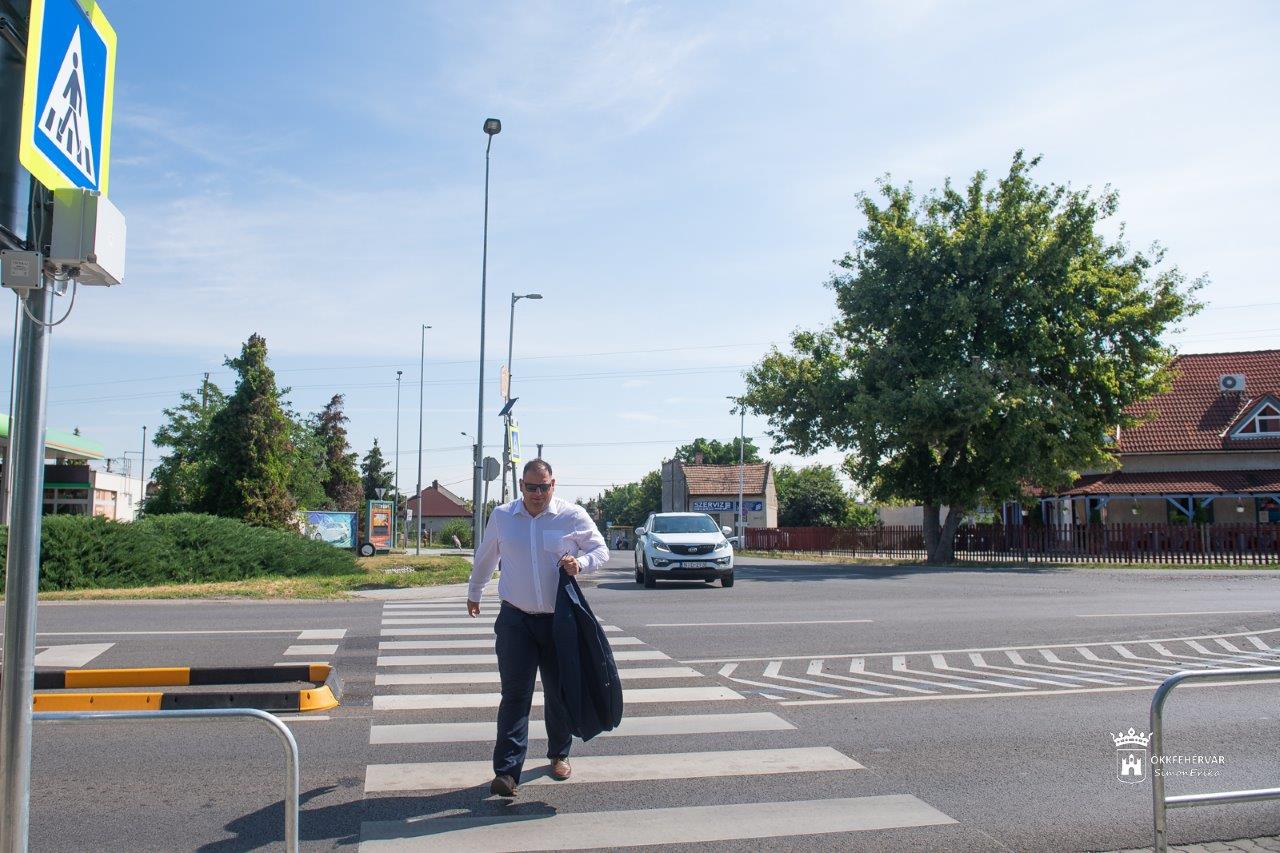 A nagyforgalmú úton lévő gyalogos-átkelőhelynél egy középsziget és két fénnyel ellátott tábla is szolgálja a gyalogosok biztonságát.