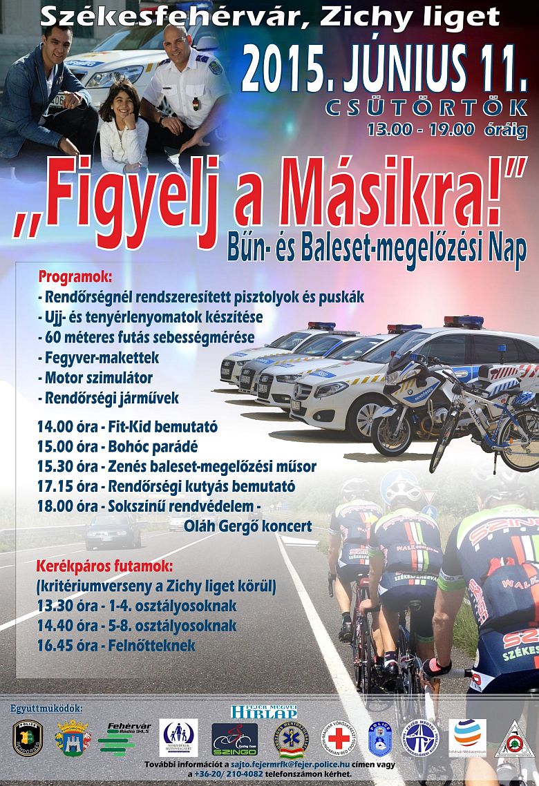 A Fejér Megyei Rendőr-főkapitányság június 11-én, délután 13 és 19 óra között Bűn- és Baleset-megelőzési Napot rendez a székesfehérvári Zichy-ligetben. A programokon lesz többek között fegyver-makettek és rendőrségi járművek bemutatója, motor szimulátor, emellett ujj- és tenyérlenyomatokat is készíthetnek az érdeklődők. A programon továbbá kerékpáros versenyt is tartanak, illetve Oláh Gergő is fellép.
