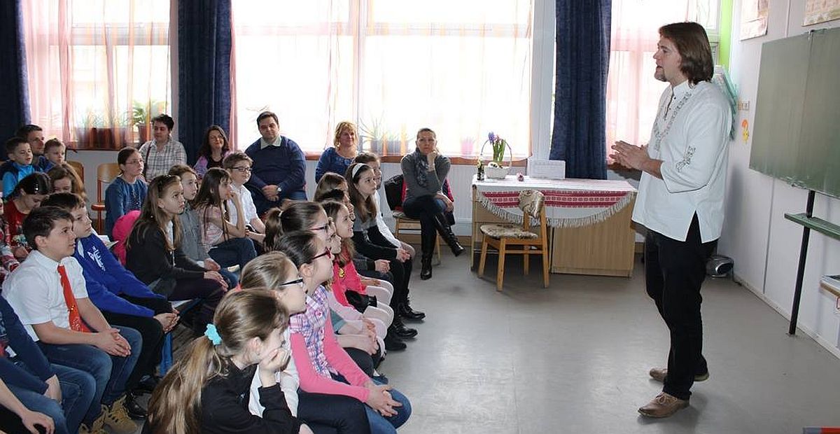 Böde Péter vándor meseíró az István Király Általános Iskolában