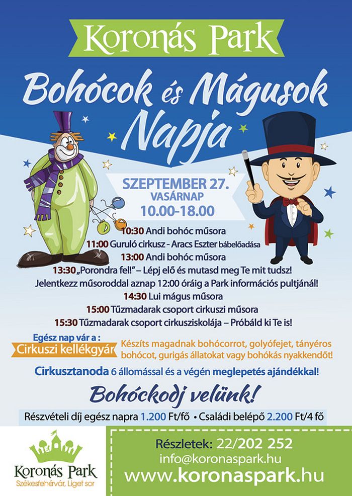 Az ezerarcú cirkusz izgalmas világából adnak ízelítőt szeptember 27-én vasárnap 10 órától a Koronás Parkban, a Bohócok és Mágusok Napján. Egy percig sem unatkozhatnak, akik kilátogatnak a Koronás Park rendezvényére, mindenki megtalálhatja a neki kedvére való foglalkozást.