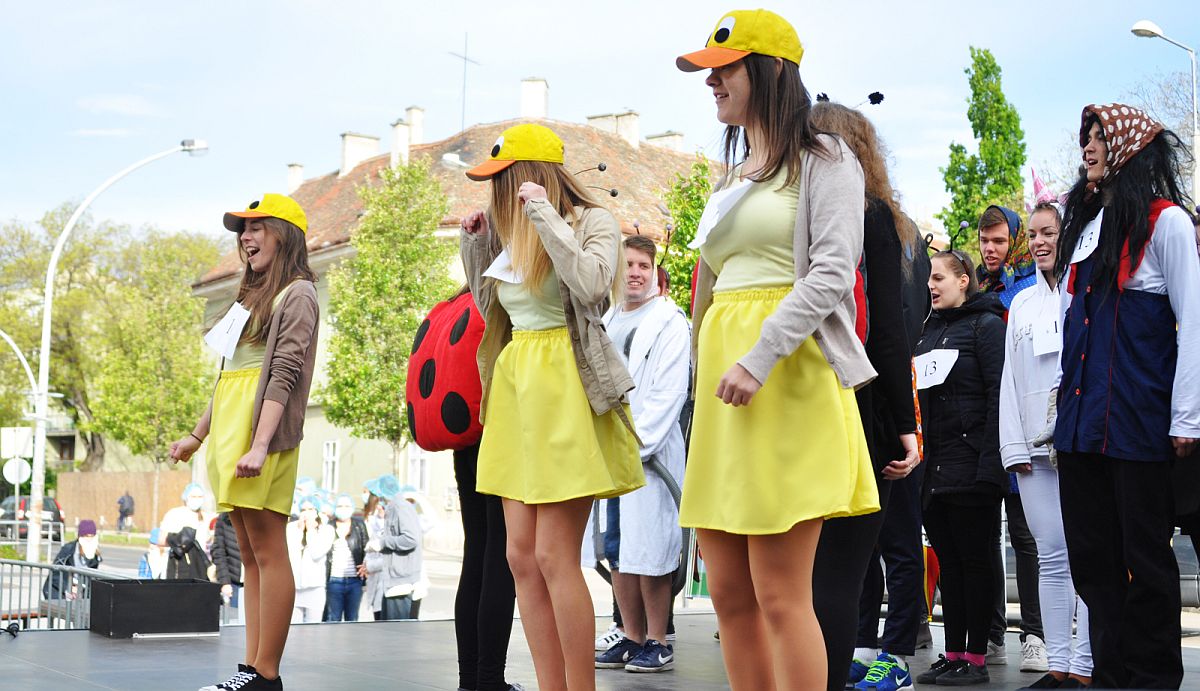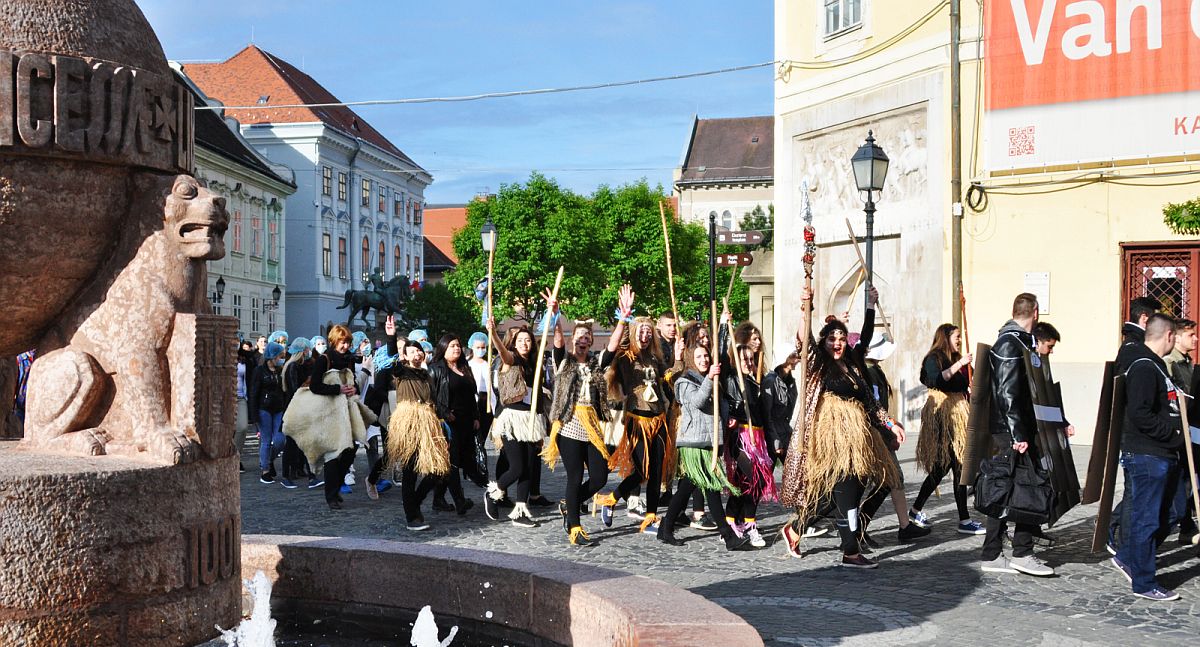 Április szeszélyeinek megfelelően szó szerint a feje tetejére állt pénteken délelőtt Székesfehérvár! Már kora reggel beöltözött műtősorvosok, múmiák, hippik, dominók, törpék és busmanok lepték el az Alba Plaza előtti teret. Az doktorok akkurátusan igazgatták maszkjait, a bennszülött amazonok fegyvereiket élesítették, az önkéntes takarítók pedig serény söprésbe kezdtek, míg az egyiptomi múmiák Kleopátrának jártak tiszteletbeli táncot. Aggodalomra persze semmi ok: a különleges és nem mindennapi lények a Ballagási Hét keretében megrendezett Bolondballagásra érkeztek. Az idei évben huszonegy osztály csatlakozott a vidám eseményhez. A diákok a történelmi Belvároson végigvonulva, a Hotel Magyar Király előtti téren felállított színpadnál mutathatták be produkciójukat a közönségnek.