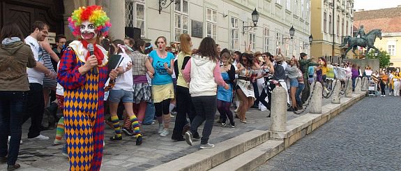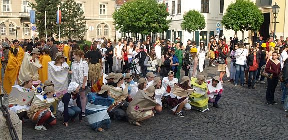 Az őrület már hét óra után elkezdődött a Városház téren. A véndiákok táncoltak, mulattak és színes produkciókkal szórakoztatták egymást. A versenyt a Belvárosi I. István Középiskola Hunyadi Mátyás tagintézményének 12. A osztálya nyerte, amelynek képviselői pattogatott kukoricának öltöztek be.