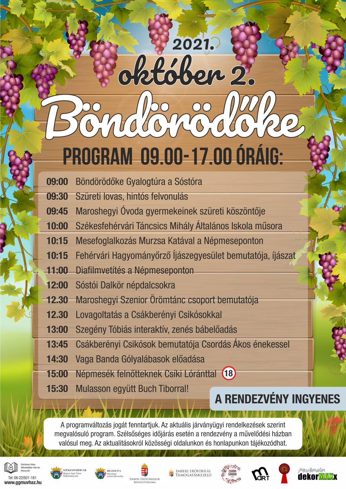 Szüreti játszóparkkal, népi játékokkal, faesztergályos bemutatóval és kiállítással is várja a fehérváriakat 2021. október 2-án, szombaton a Böndörödőke Maroshegyen a Gárdonyi Géza Művelődési Ház és Könyvtár előtti területen. A gyerekeket mesterségkóstoló játszóházzal, MintaKINCStár néven játékszigettel és népzenés-néptáncos programokkal is várják, de lesz lovagoltatás és csikós bemutató is.