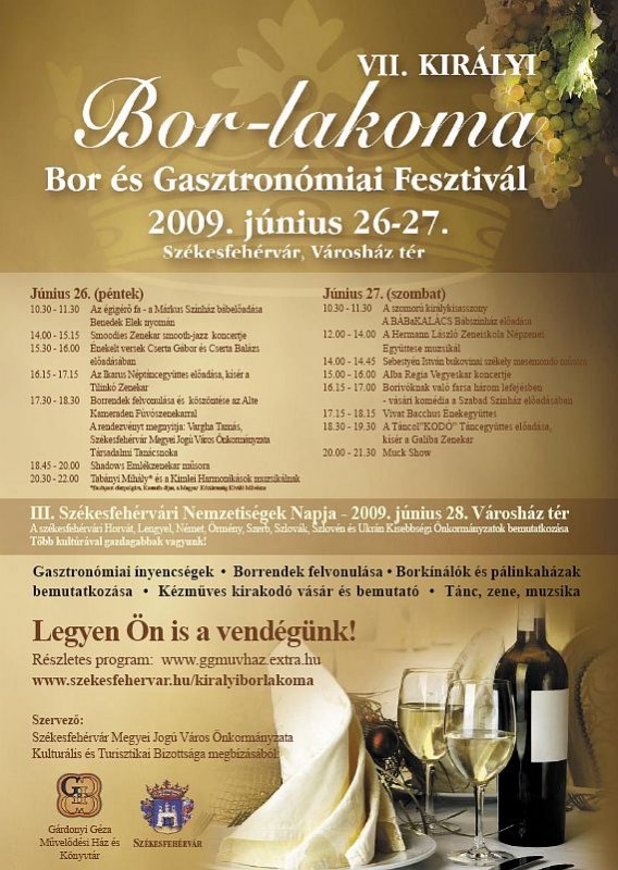 Pénteken és szombaton már hetedik alkalommal rendezik meg Székesfehérvár Főterén a Bor-lakoma Bor és Gasztronómiai Fesztivált. Június 26-27-én délelőtt bábelőadásokkal várják a gyerekeket és a családokat kora délutántól pedig koncertek lesznek. Pénteken este Tabányi Mihály és a Kimlei harmónikások játszanak, szombaton Muck Show lesz a Főtéren.