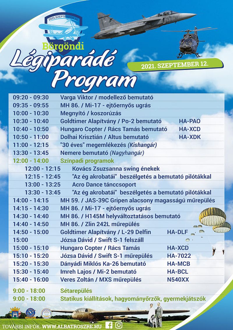 Izgalmas, látványos programokat kínál égen és földön a Börgöndi Légiparádé, amelyet az Albatrosz Repülő Egyesület a hagyományokhoz hűen szeptember második hétvégéjén rendez meg. A dinamikus programban a tervek szerint feltűnik majd az égbolton a vasmadarak közül a H145M, a Mi-17, a JAS-39C Gripen, Józsa Dávid világbajnok vitorlázórepülő egy Swift S-1 -t vezet majd. Veres Zoltán műrepülő és az L-29 Delfin is.