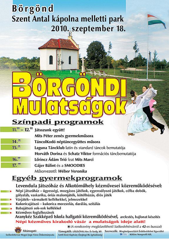 Hagyományteremtő szándékkal szeretnék újjáéleszteni Börgöndpusztán a Börgöndi Mulatságok rendezvényét. Szeptember 18-án szombaton a városrész Szent Anna kápolna melletti parkjába várják a terület lakóit és a székesfehérváriakat.Szeretnék, ha sokan megismernék Fehérvár ezen részét, ezért remélik, sokan látogatnak majd ki – mondta el a terület képviselője, Dienesné Fluck Györgyi.