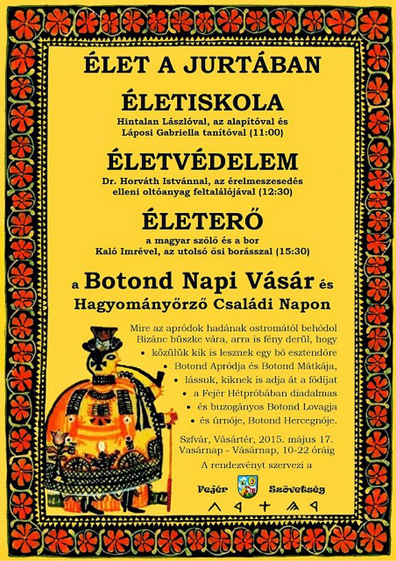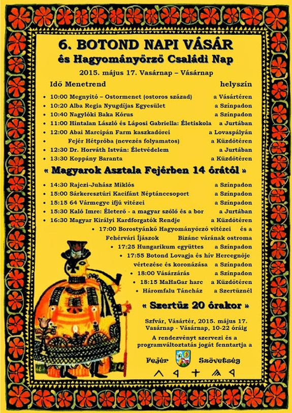 A Fejér Szövetség ez évben rendkívüli változtatásokkal rendezi meg hagyományos vásárát. A mintegy 50 hagyományőrző vitéz ostormenetével megnyitott találkozón felelevenítik Bizánc várának ostromát is. A hagyományőrző találkozón a buzogányos Botond Vitéz Lovagja és koronás hölgye, Botond Vitéz Hercegnője adja át a jövő nemzedéknek a Botond Vitéz Apródja és Mátkája díjakat.