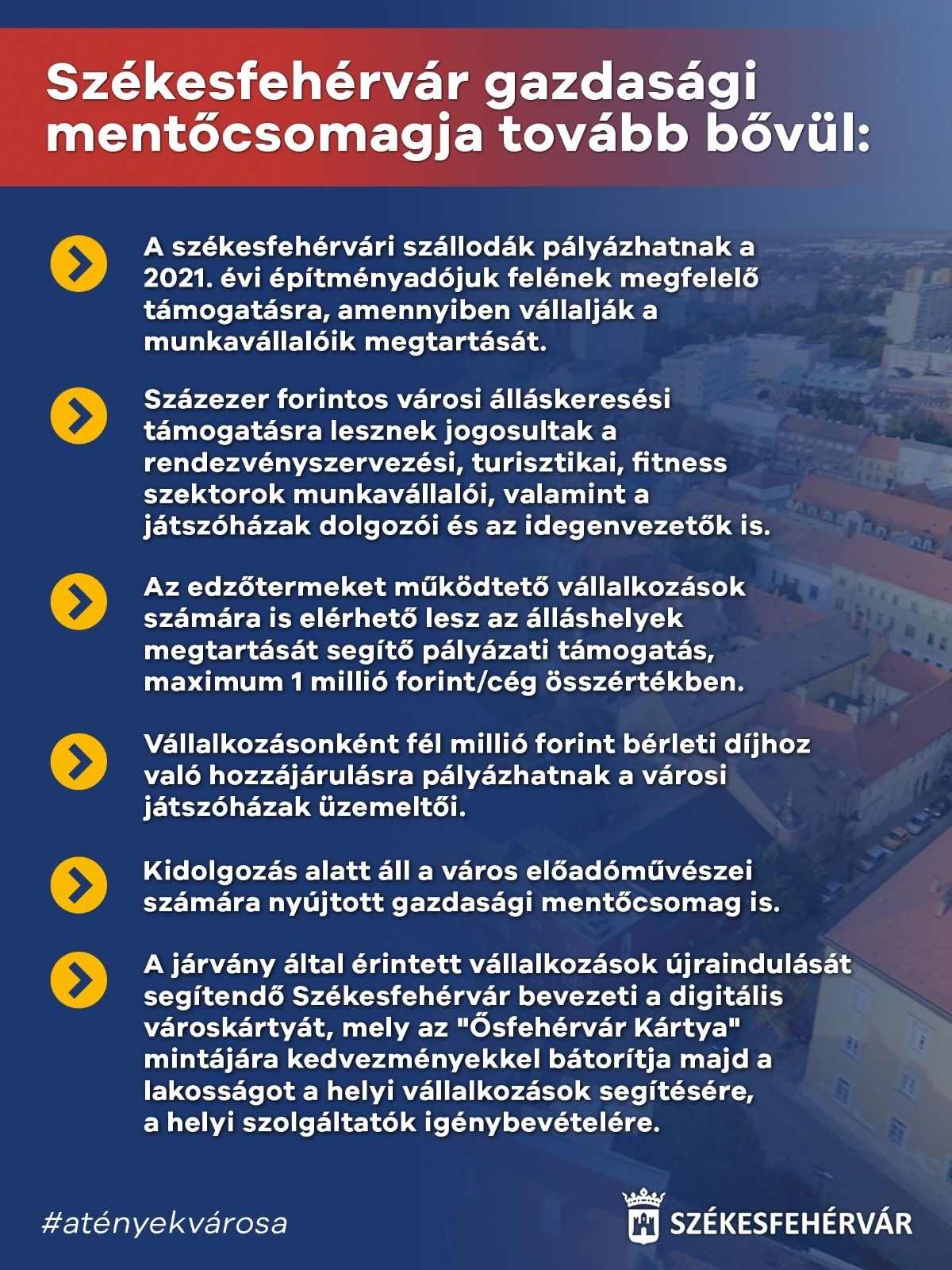 Székesfehérvár polgármestere újságírói kérdésre válaszolva elmondta, hogy a mentőcsomag összege elérheti a több tízmillió forintot, a pontos adat a kérelmek beérkezése után számítható ki. Fontos megjegyezni, hogy a támogatásokat az iparűzési adóbevételnek, a legnagyobb adózóknak köszönhetően tudja finanszírozni az Önkormányzat. A gazdasági mentőcsomagnak kettős célja van: az intézkedések a vállalkozások lehető leghamarabbi újraindítását és minél több álláshely megőrzését szolgálják.