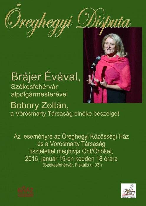 2016. január 19-én rendezik meg az év első disputáját az Öreghegyi Közösségi Házban. A 18 órakor kezdődő rendezvényen Bobory Zoltán, a Vörösmarty Társaság elnöke ezúttal Brájer Évával, Székesfehérvár alpolgármesterével beszélget. A belépés díjtalan.