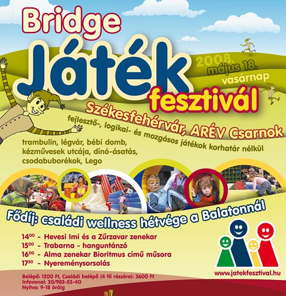 Több száz ingyenes belépőt ajánlott fel székesfehérvári óvodásoknak a hétvégi Bridge Játékfesztivál szervezője. Az ARÉV Sportcsarnokba szervezett családi rendezvényre május 18-án vasárnap korhatár nélkül várnak mindenkit, akik szeretik a fejlesztőjátékokat. Lesz babajátszótér, óriás legóvár-építés, dinoszaurusz-ásatás, kézművesjátékok és rengeteg fejlesztőjáték...