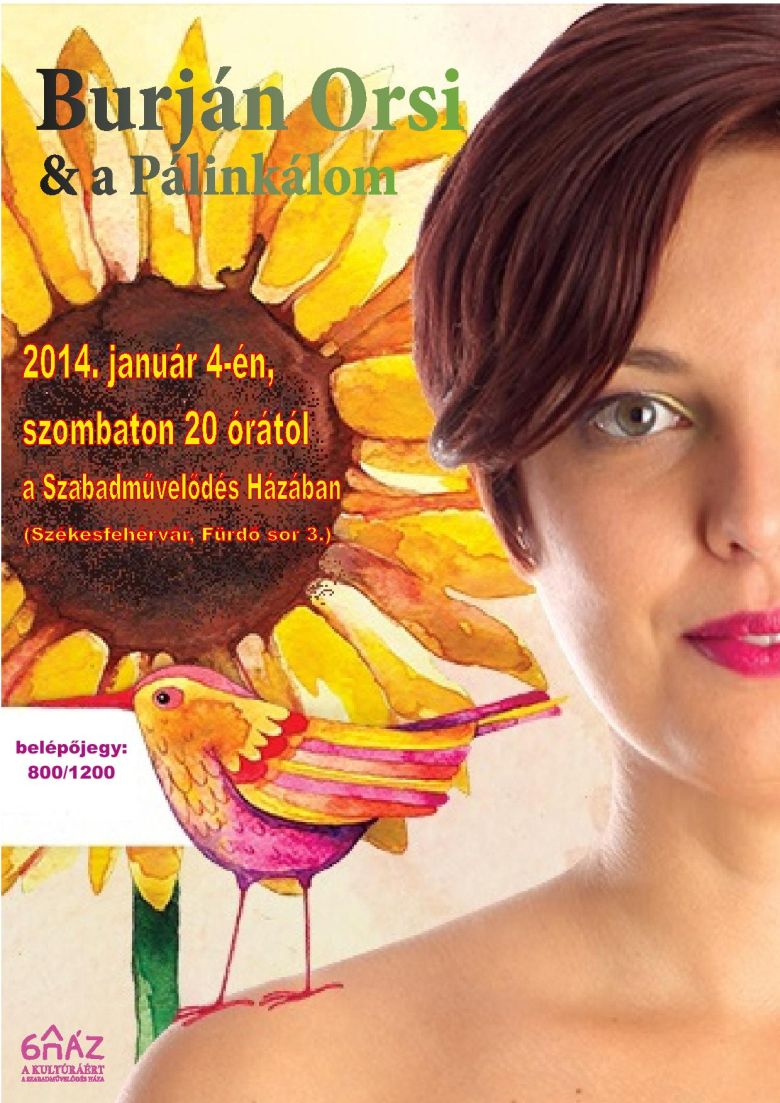 Burján Orsi és a Pálinkálom lép fel január 4-én este A Szabad- művelődés Házában. A zenekar, tagjai szinte valamennyien Hollandiában élő kiváló fiatal jazz zenészek. Repertoárjukon magyar népdalok jazz-es hangszerelései szerepelnek egy rendkívül egyedi, színes és izgalmas megfogalmazásban, gazdag harmóniavilággal fűszerezve.