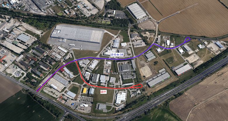 Marad a 13Y járat a régi nyomvonalon (piros) és a Karsai Holding előtt furdul meg továbbra is, a 13G és a 16-os pedig kimegy a Babér utca új buszfordulójáig, alkalmazkodva a műszakváltásokhoz.