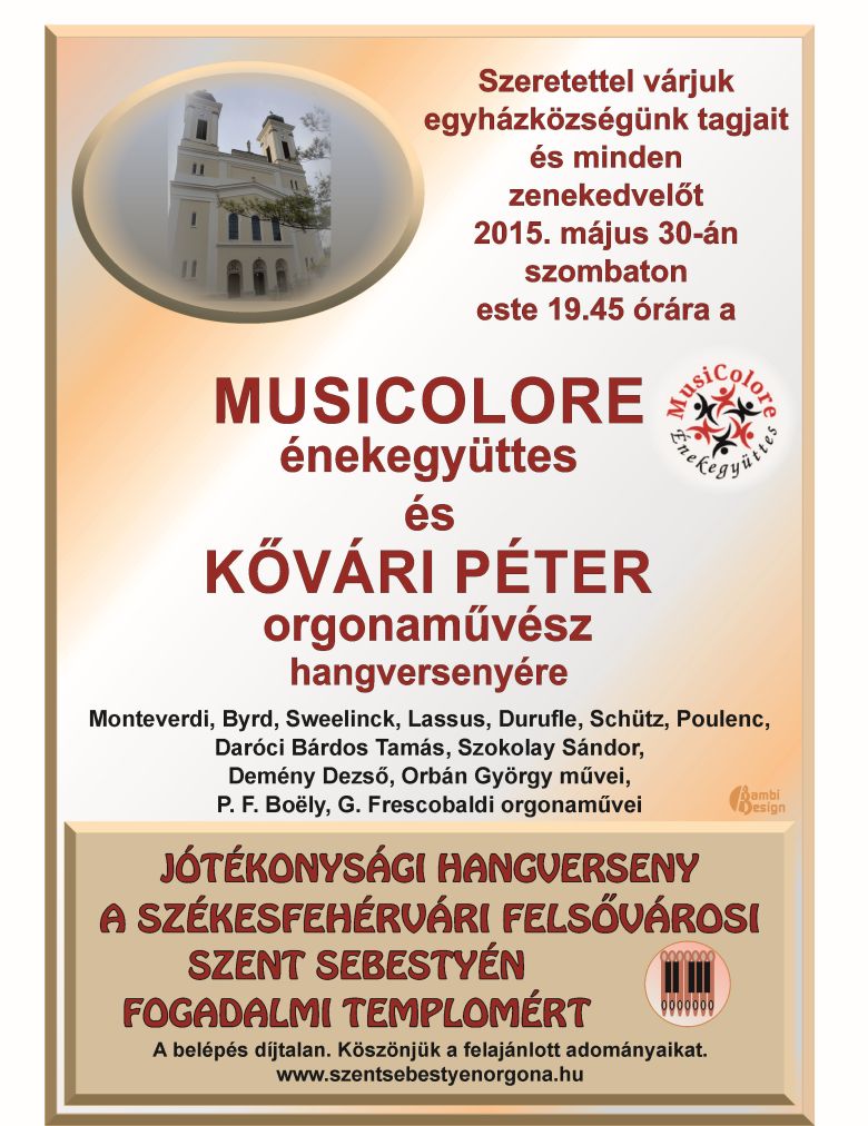 Gördül tovább a székesfehérvári Szent Sebestyén fogadalmi templomért szervezett sikeres koncertsorozat. A következő hangversenyre „Cantate Domino” címmel május 30-án szombaton 19.45 órától kerül sor a felsővárosi templomban. Fellép a MusiColore Énekegyüttes és Kővári Péter orgonaművész.