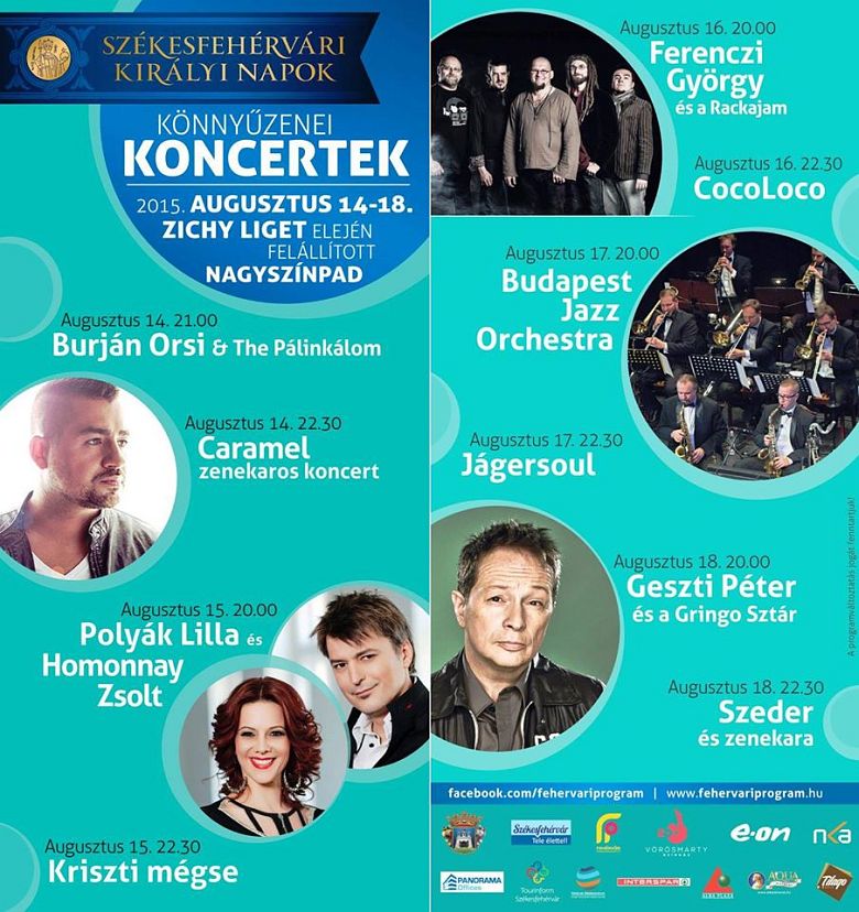 A Budapest Jazz Orchestra augusztus 17-én, hétfőn 20.00 órától koncertezik Székesfehérváron. A koncertprogram gerincét ezen az estén a saját szerzemények és hangszerelések, illetve az elmúlt években vendégül látott külföldi szólisták (többek között George Duke, Peter Erskine, Mark Nightingale) darabjai alkotják. Magyarország legeredetibb acid-jazz zenekara, a 2004-ben alakult Jágersoul együttes koncertje hétfőn 22.30 órakor kezdődik. Az együttes által "kozmopuritán"-nak nevezett popzenét játszó Gringosztár és Geszti Péter augusztus 18-án, kedden 20.00 órakor a reggae, jazz, pop, rap, elektronikus zene, ska és balkáni népzene egyvelegéből álló dalaikkal lép színpadra. Szeder, azaz Szeder-Szabó Krisztina énekes-gitáros-dalszerző és zenekara életigenlő, könnyed, mégis erős stílusú dalokkal várja a közönséget 22.30 órától a Hotel Magyar Király előtti téren, a Zichy színpadon.