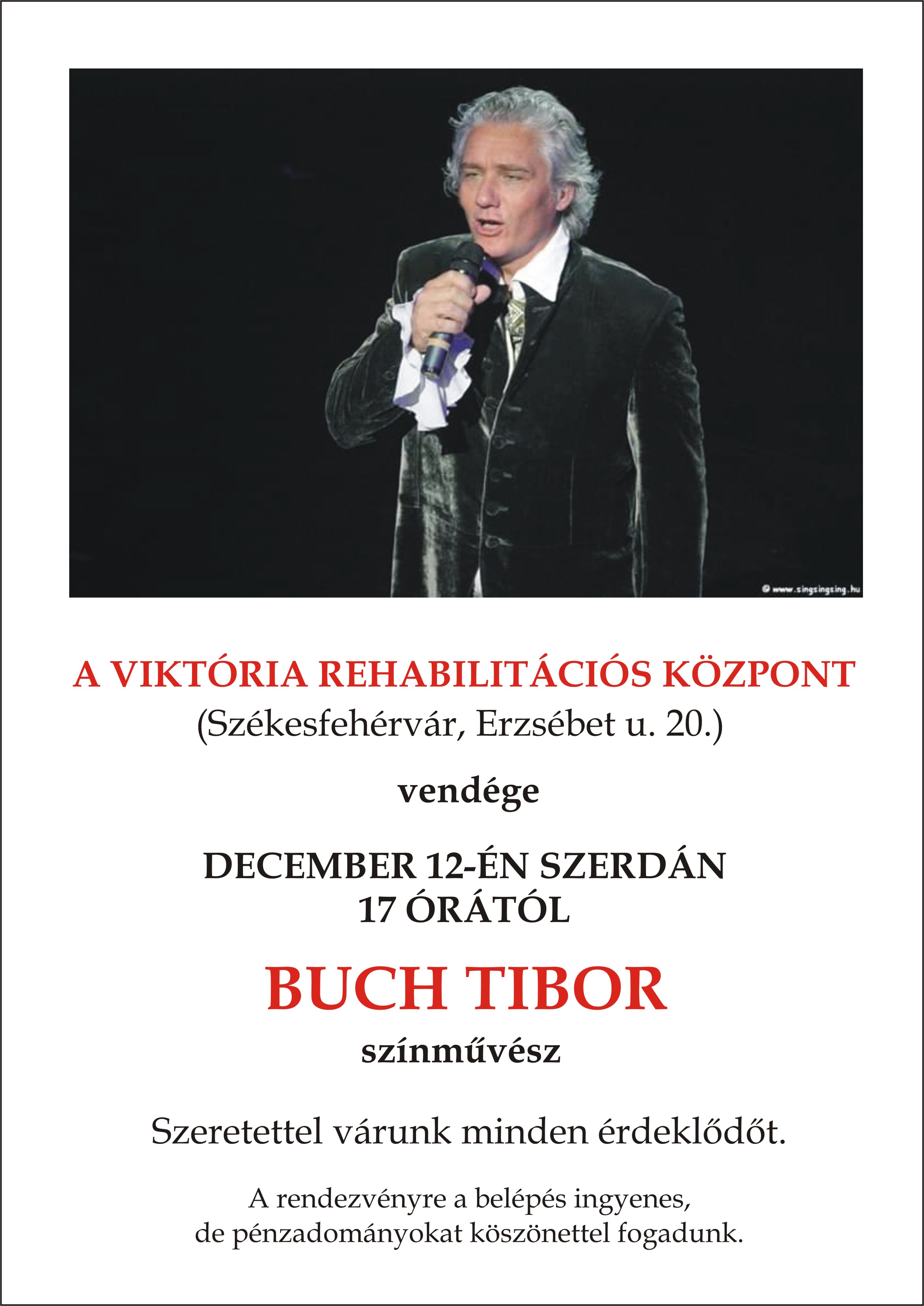 December 12-én szerdán 17 órakor Buch Tibor színművész lesz a vendég a Viktória Rehabilitációs Központban, a rendezvényre a belépés ingyenes. Az Aranyalma és Pro Theatro díjas színészt számos szerepben láthatta a közönség a Vörösmarty Színházban, az Operettszínházban és a debreceni Csokonai Színházban is.