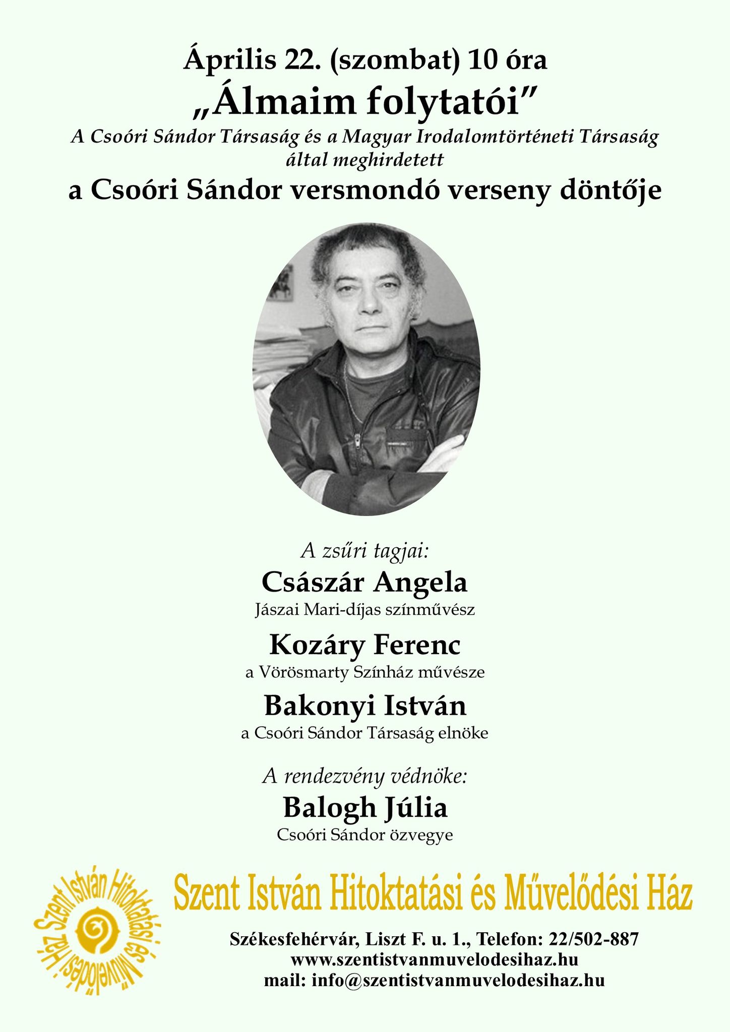 Április 22-én szombaton rendezi meg a Csoóri Sándor Társaság a Magyar Irodalomtörténeti Társasággal közösen az Álmaim folytatói című versmondó verseny döntőjét a Szent István Hitoktatási és Művelődési Házban. A megmérettetésen középiskolás diákok vesznek részt.