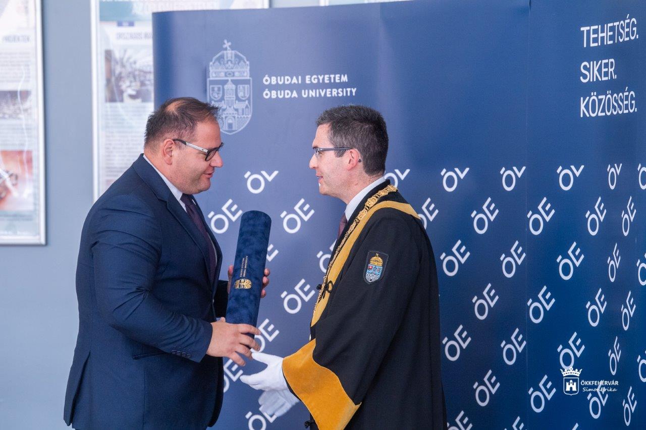Mint a felterjesztésben szerepel, az Óbudai Egyetem az Alba Regia Műszaki Kar és a műszaki felsőoktatás fejlesztése érdekében kifejtett tevékenységért, a hallgatói közösséget építő és a hallgatói életet ösztönző kezdeményezéseiért, valamint a fehérvári duális felsőoktatási együttműködési hálózatban vállalt aktív szerepe elismeréseként adományozta az elismerő címet Székesfehérvár alpolgármesterének.