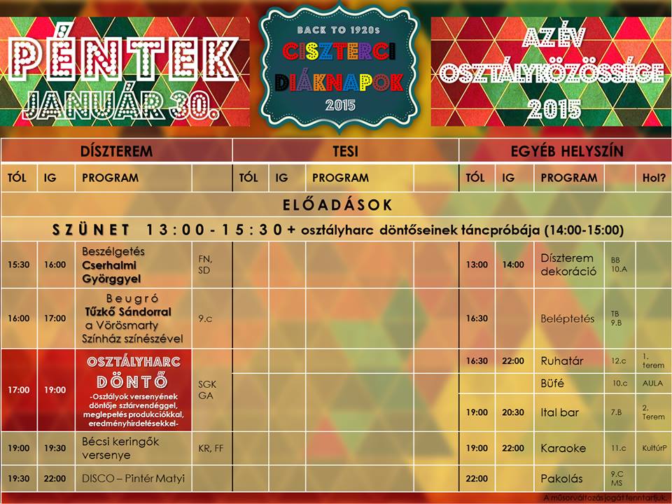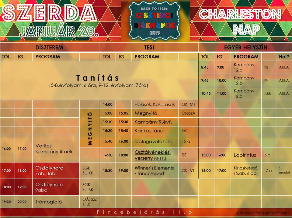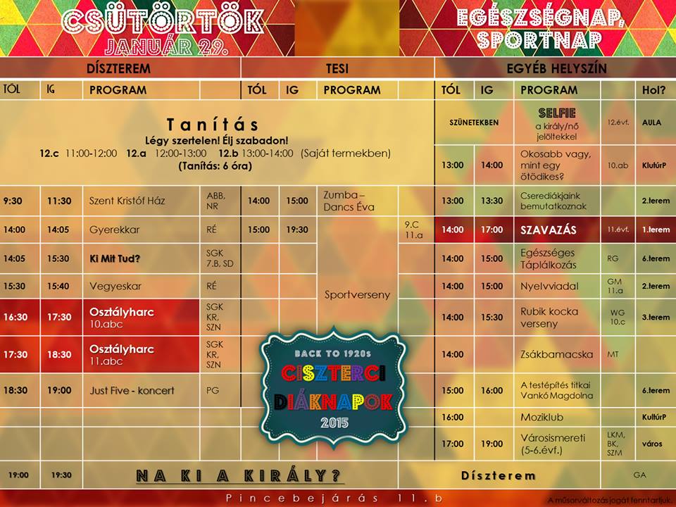 Már a reggeli óráktól tematikus programokkal várják a diákokat szerdától a Ciszterci Szent István Gimnáziumban. Az 1920-as évek hangulatát idézik fel, hiszen az egész nap a charleston jegyében zajlik, a diákok jelmezt is öltenek majd. Az óraközi szünetekben az iskola aulájában bemutatkoznak a királyjelölt párok.