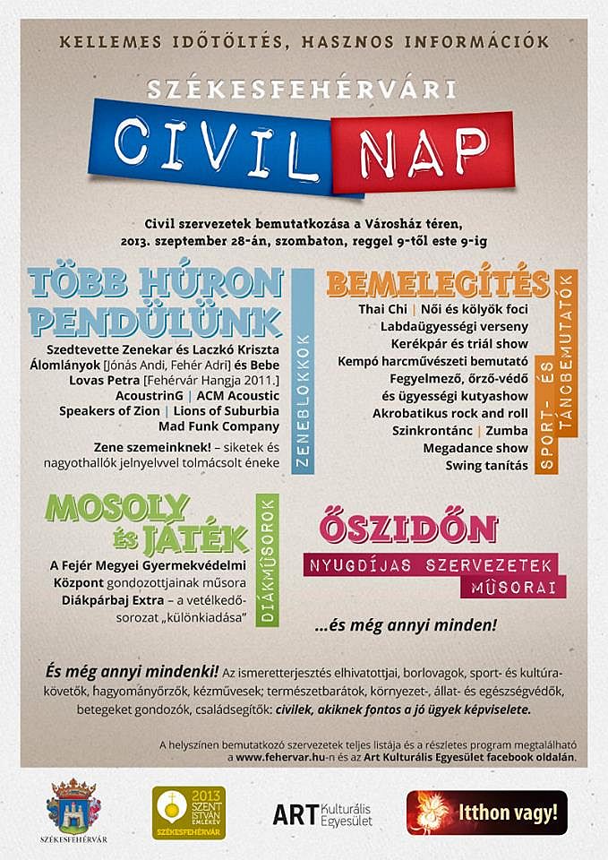 A Székesfehérváron működő civil szervezeteknek minden évben hagyományosan Civil Napot szervez a város Önkormányzata. Ezúttal szeptember 28-án, szombaton 09.00 órától várják az érdeklődőket a Városház térre, ahol negyven, a legkülönfélébb tevékenységeket folytató szervezet mutatkozik be, és kínál programokat. Az arculatában megújult, már logóval is rendelkező Civil Nap az önkormányzat koordinálásával, az egyesületekkel és alapítványokkal történő szoros együttműködésben valósul meg. A szervezetek rövid és frappáns bemutatókat, foglalkozásokat tartanak, ezen kívül színpadi produkciók, élő koncertek sokasága színesíti a rendezvénysorozatot.