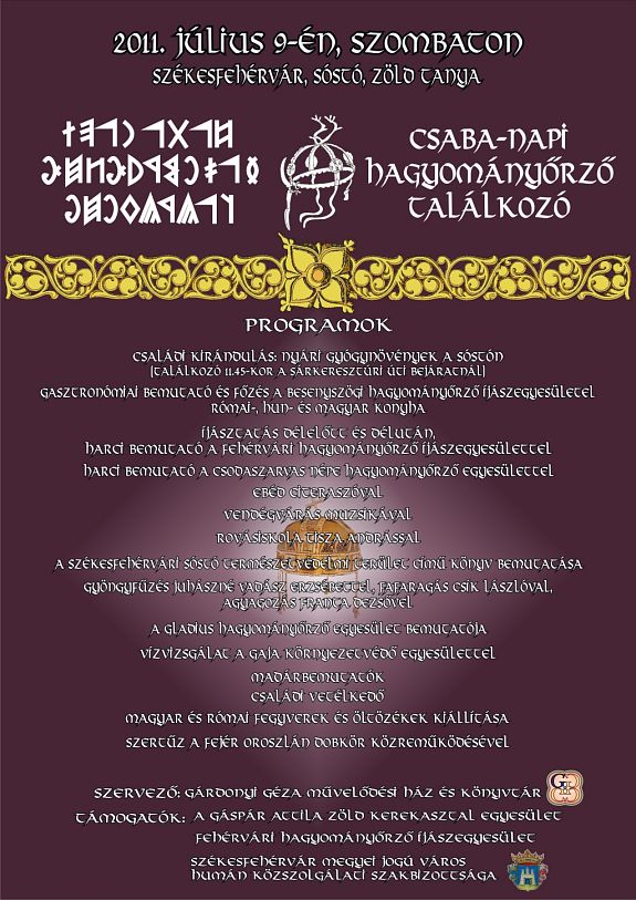 Július 9-én szombaton ismét megrendezik a Csaba-napi hagyományőrző találkozót a Sóstón található Zöld tanyán. A Sóstón gyógynövény túrát tartanak, lesz gasztronómiai bemutató és természetesen nem maradnak el a hagyományos harci bemutatók sem. A gyerekeket agyagozás és fafaragás várja, lesz madárbemutató is a napot pedig szertűz zárja majd.