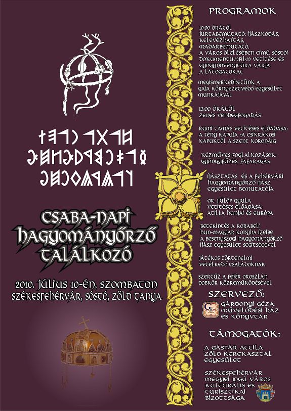 Július 10-én, szombaton délelőtt 10 órától a Csaba-napi Hagyományőrző Találkozó lesz Székesfehérváron, a Sóstói Természetvédelmi Területen, a Zöld-tanyán. Délelőtt gyógynövénytúra is várja a látogatókat, felállítanak egy jurtát, kézműves foglalkozások lesznek, a Fehérvári Hagyományőrző Íjász Egyesület pedig bemutatója mellett alkalmat ad arra is, hogy kipróbálják az íjászatot az érdeklődők.