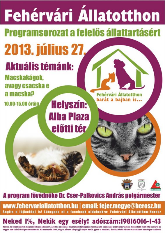 Újabb állomásához érkezik szombaton a „Fehérvári Állatotthon - Közelebb a polgárokhoz” című program. Ezúttal a cicák lesznek a középpontban, örökbeadásra váró állatokkal, előadással, tanácsadással, különféle érdekességekkel várják az érdeklődőket az Alba Plaza előtti téren.