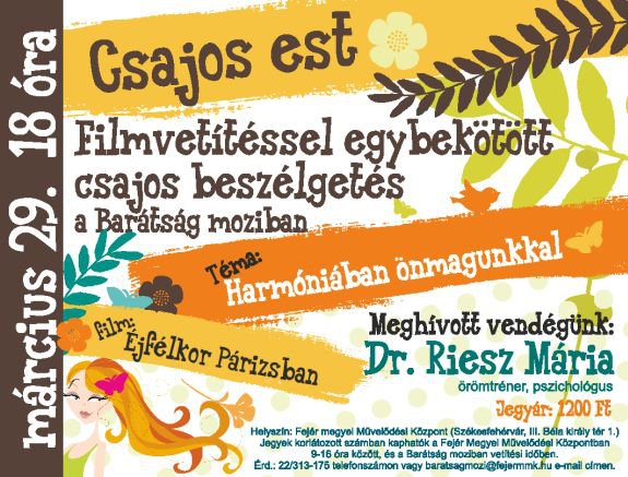 A Barátság Mozi március 29-én, csütörtökön 18.00 órakor kezdődő Csajos est-jén Dr. Riesz Mária örömtréner és pszichológus tart előadást és bemutató gyakorlatokat a pozitív énkép kialakításához. A beszélgetést filmvetítés követi. Az est témája: "Harmóniában önmagunkkal." Vajon mi is a harmónia? A jó és a rossz egyensúlya az emberben? Lehetek-e harmóniában önmagammal, ha a környezetemmel vagy a kapcsolataimmal nem vagyok? Ezekre a kérdésekre keresik a válaszokat.