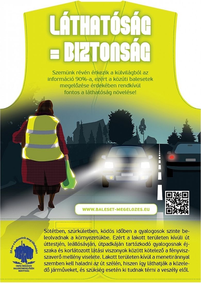 A gépjárművek tompított fényszórói 35-45 m távolságban világítják meg az útfelület egy részét, azonban ez a távolság az esős, ködös, párás időben jelentősen lecsökkenhet. A szürke-fekete, környezetbe olvadó ruházatú, láthatósági eszközöket nem viselő gyalogos baleseti kockázata megnő, így féktávolságon belül könnyen elüthetik őket. Lakott területen kívül a gyalogosoknak kötelező a forgalommal szemben közlekedni, mert így jobban látják a szemből érkező forgalmat. Saját közlekedésbiztonságunk érdekében tenni kell valamit! Ennek egyik módja a LÁTHATÓSÁG növelése.
