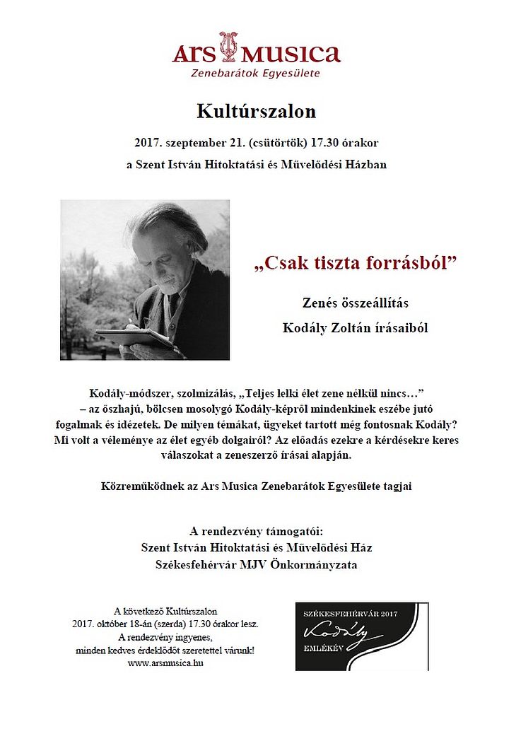 "Csak tiszta forrásból" címmel csütörtökön 17.30-tól a Szent István Művelődési Házban hallhatnak összeállítást az érdeklődők Kodály Zoltán írásaiból. Közreműködnek az Ars Musica Zenebarátok Egyesülete tagjai. Az előadás után mindenkit várnak egy jóízű beszélgetésre és egy csésze teára.