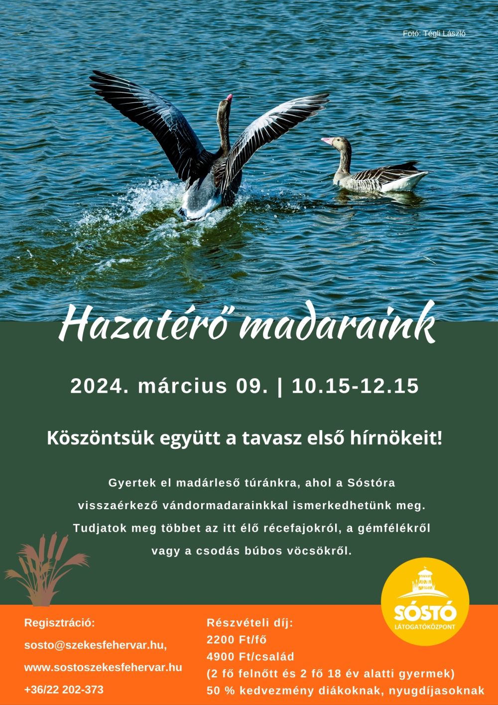 Március 9-én, szombaton 10.15 órakor a Látogatóközponttól indul a mintegy kétórás ökotúra, melynek során a hazatérő vándormadarak nyomába eredhetnek a természetbarátok. Sok érdekességet megtudhatnak a tavasz első hírnökeiről, a különböző récefajokról, a gémfélékről és a csodálatos búbos vöcsökről. Részletek itt.