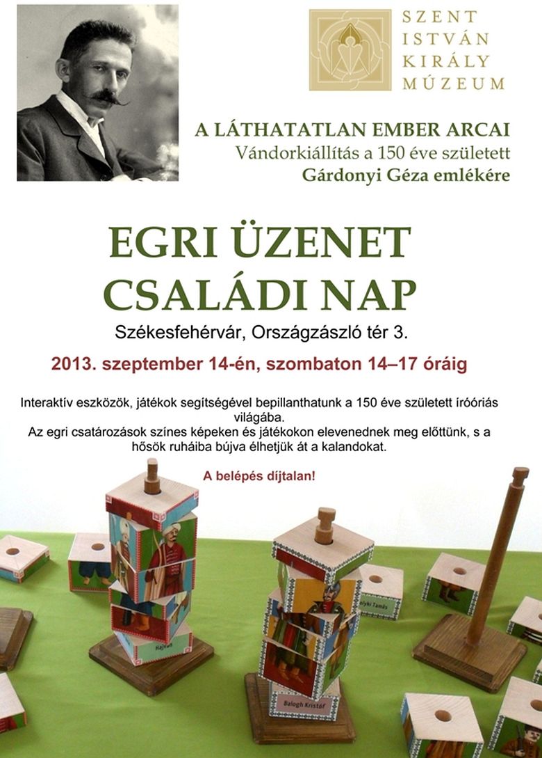 Szeptember 14-én, szombaton 14–17 óráig interaktív eszközök, játékok segítségével bepillanthatunk, a 150 éve született Gárdonyi Géza világába a Szent István Király Múzeum Országzászló téri épületében. Az egri csatározások színes képeken és játékokon elevenednek, sőt a bátrabbak hősök ruháiba bújva élhetik át a kalandokat. A belépés díjtalan.