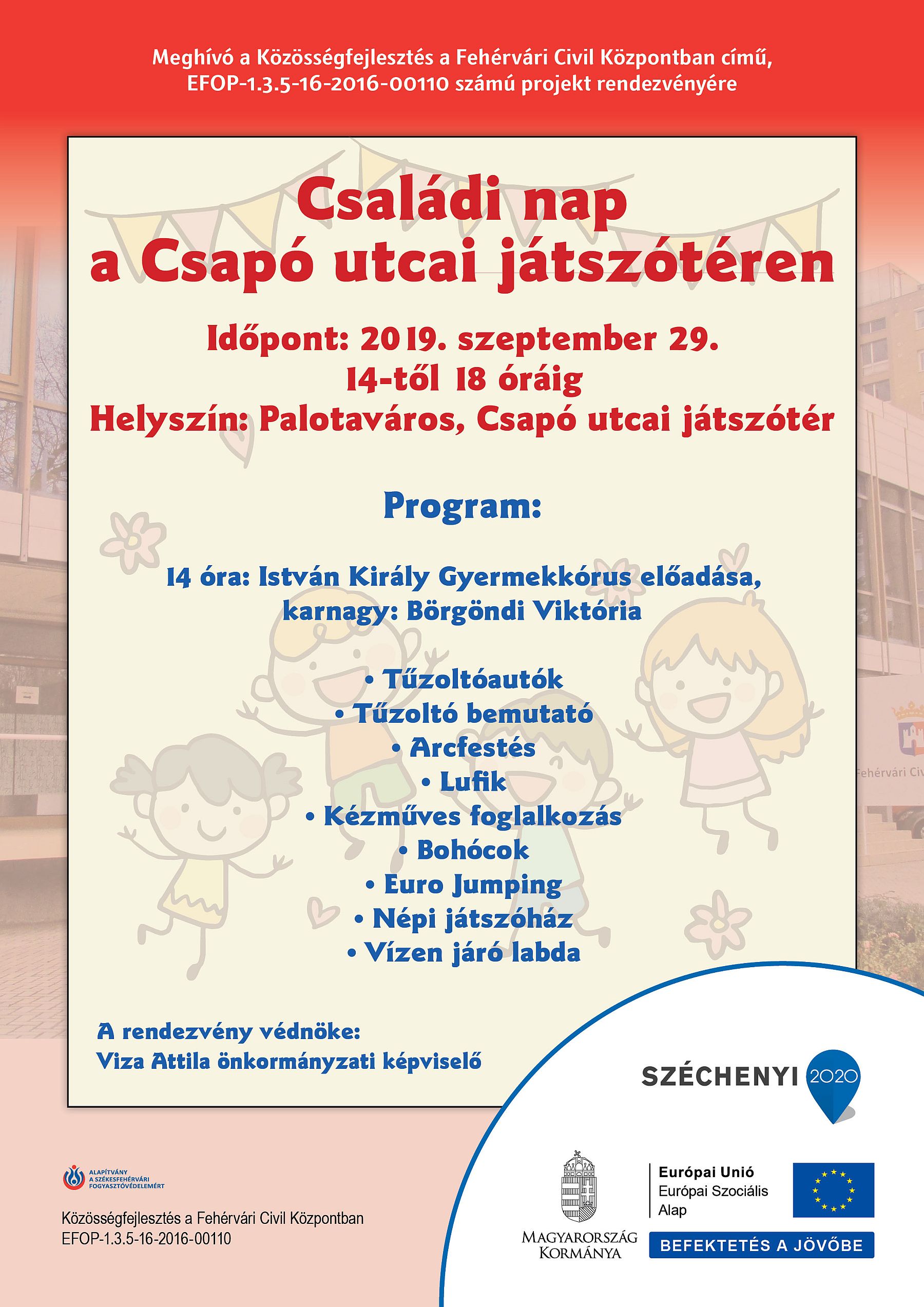 A családi nap 14 órakor az István Király Gyermekkórus előadásával kezdődik, majd euro jumping, vízen járó labda, arcfestés, játszóház, kézműves foglalkozás, csillámtetoválás, lufi, bohóc, tűzoltóautók és tűzoltó bemutató várja a kicsiket és nagyokat.
